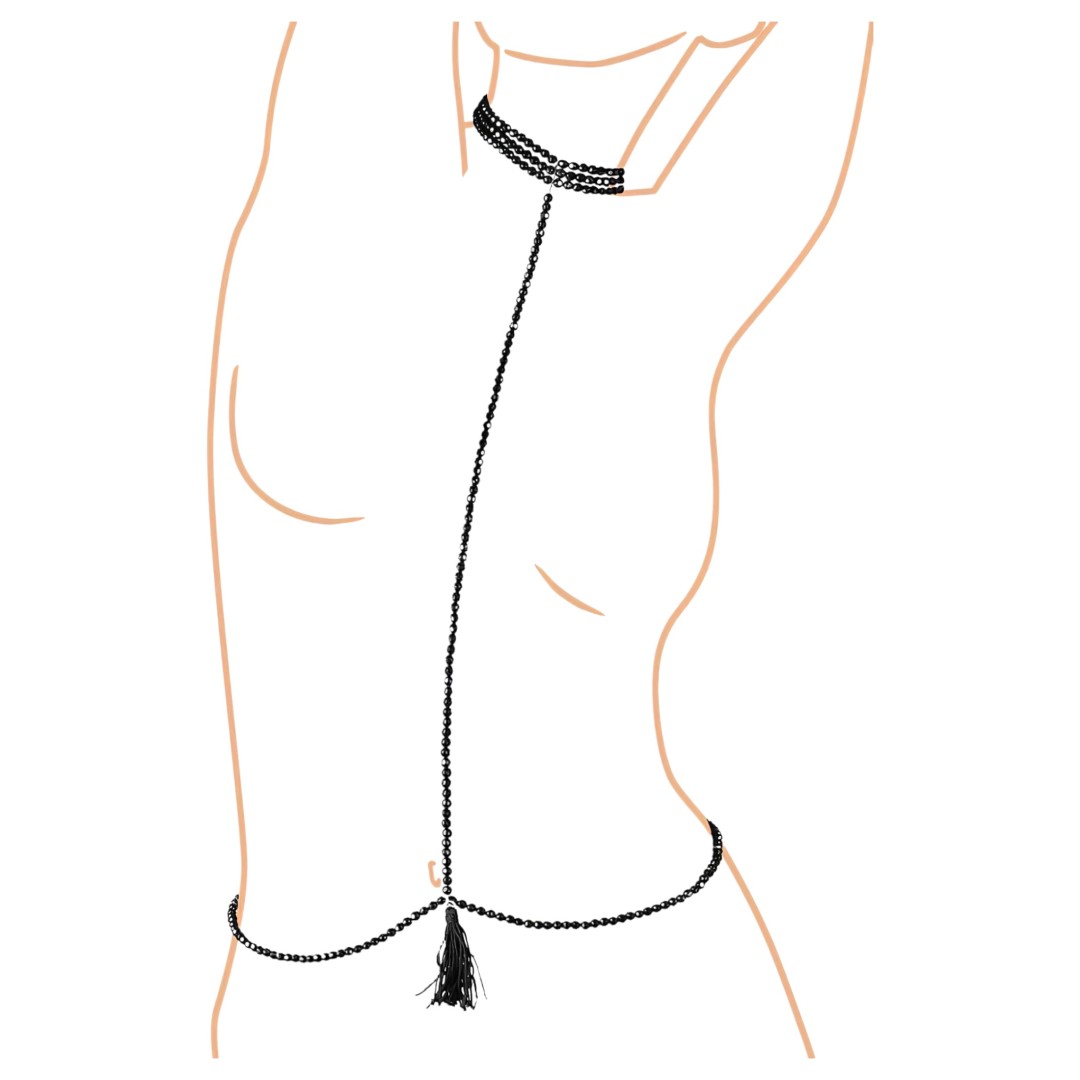 Három sor, csillogó, fekete gyöngyből álló, rugalmas nyakpánt és egy sor gyöngyből álló csípőlánc, szintén gyöngyös összekötővel, mely kis karabinerrel csatlakozik a csípőgyöngysorhoz, kis bojttal díszítve.